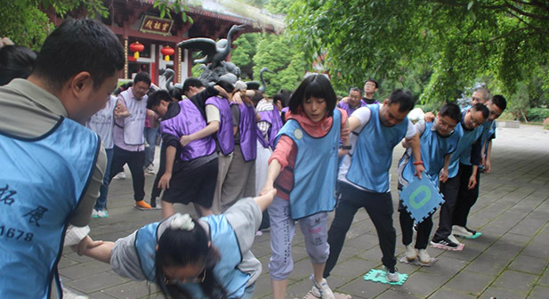 第二天,在拓展活动开始前,为了体现活动的趣味性和竞争性,现场组建四支队伍,各队推选了队长、制定了响亮的口号。经过了暖场游戏后,相继开展了趣味性强、需要齐心协作共同完成的“抢滩登陆”“等分夺秒”“旱地冰壶”等团建活动。